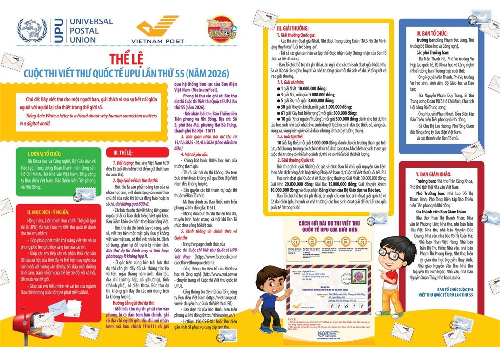 Cuộc thi Viết thư Quốc tế UPU lần thứ 55 (năm 2026) đã chính thức được phát động trên phạm vi cả nước. Cuộc thi do Bộ Khoa học và Công nghệ phối hợp với Bộ Giáo dục và Đào tạo, Trung Ương Đoàn TNCS Hồ Chí Minh, Hội nhà văn Việt Nam, Tổng Công ty Bưu điện Việt Nam và Báo Thiếu niên Tiền phong và Nhi đồng tổ chức.
