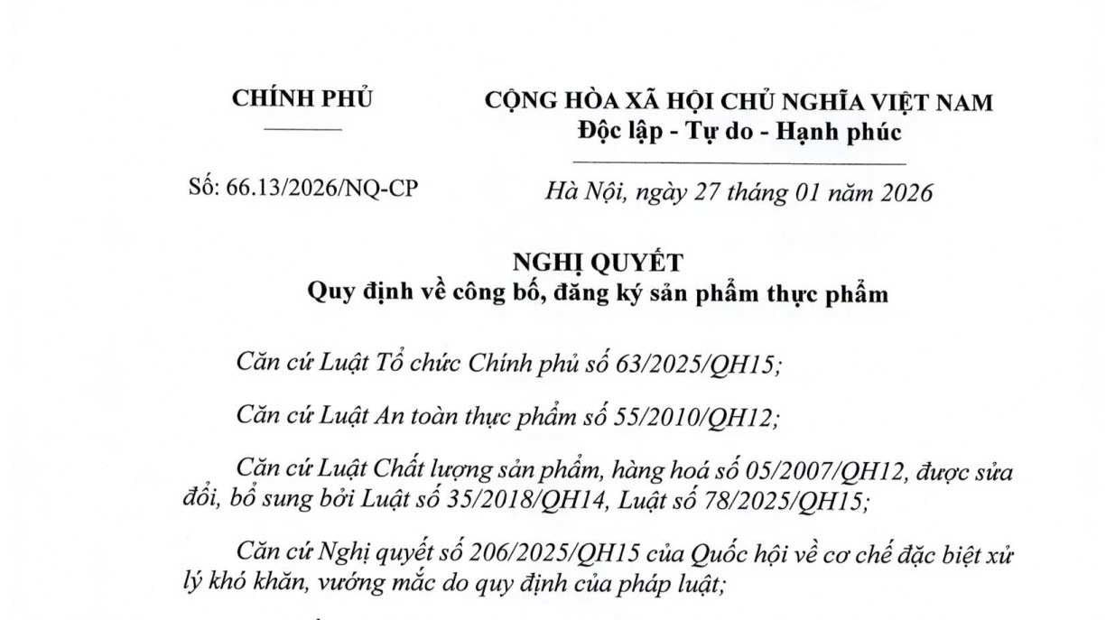 Ngày 27/01/2026, Chính phủ ban hành Nghị quyết số 66.13/2026/NQ-CP về công bố, đăng ký sản phẩm thực phẩm nhằm tăng cường hiệu quả quản lý nhà nước về an toàn thực phẩm, đồng thời tháo gỡ khó khăn, vướng mắc trong quá trình thực hiện thủ tục công bố sản phẩm của doanh nghiệp.