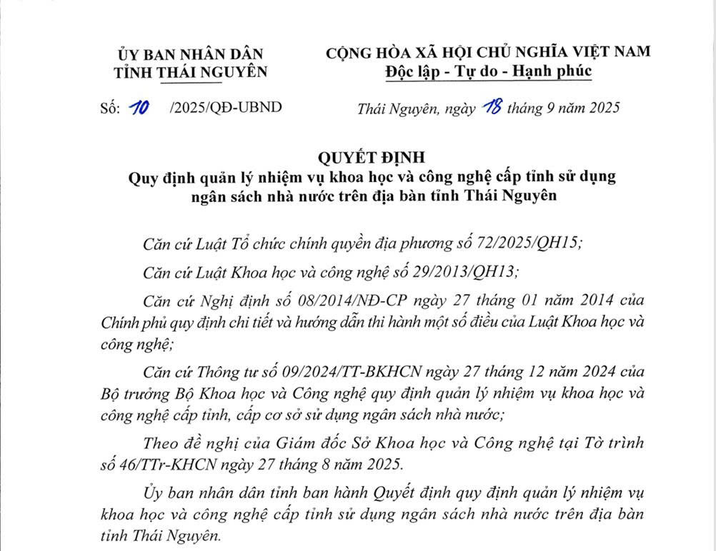 Ngày 18/9/2025, UBND tỉnh Thái Nguyên ban hành Quyết định số 10/2025/QĐ-UBND quy định quản lý nhiệm vụ khoa học và công nghệ cấp tỉnh sử dụng ngân sách nhà nước trên địa bàn tỉnh.