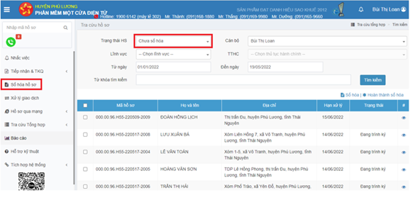 Bước 1: Đăng nhập vào phần mềm một cửa điện tử chọn mục“Số hóa hồ sơ” hệ thống hiện thị danh sách hồ sơ chưa được số hóa.