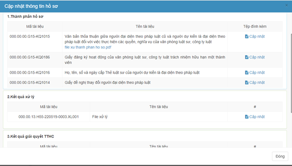 Bước 3: Cập nhật các file tài liệu của: “1. Thành phần hồ sơ”, “2. Kết quả xử lý”, “3. Kết quả giải quyết TTHC”.