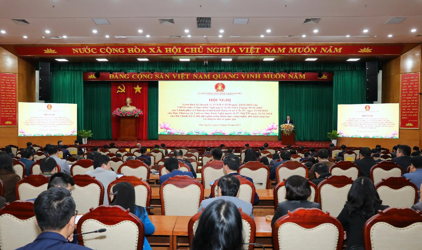 Chiều 21/2, UBND tỉnh Thái Nguyên tổ chức Hội nghị triển khai Kế hoạch số 25/KH-UBND ngày 24/01/2025 của UBND tỉnh về thực hiện Nghị quyết số 03/NQ-CP ngày 09/01/2025 của Chính phủ và Chương trình hành động số 62-Ctr/TU ngày 23/01/2025 của Ban Thường vụ Tỉnh ủy thực hiện Nghị quyết số 57-NQ/TW ngày 22/12/2024 của Bộ Chính trị về đột phát phát triển khoa học, công nghệ, đổi mới sáng tạo và chuyển đổi số quốc gia.