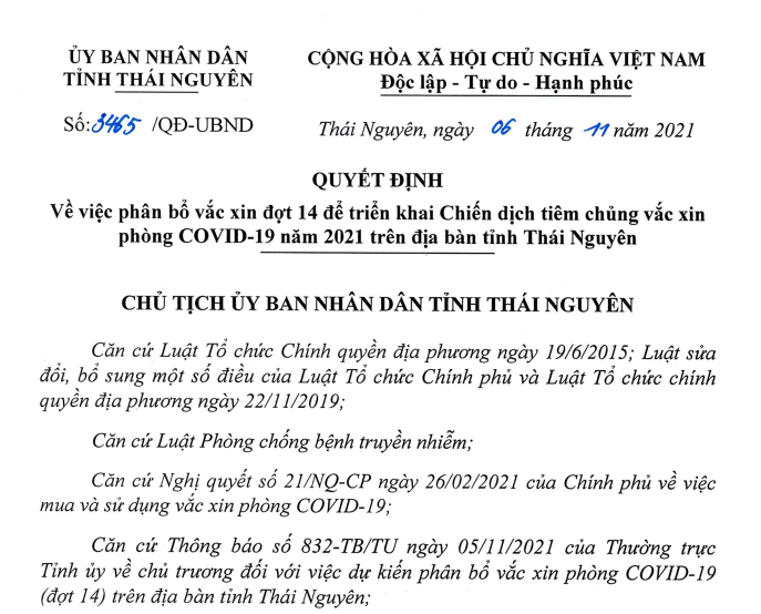 Thực hiện việc phân bổ vắc xin phòng Covid-19 (các đợt 73,74 và 76,77,78,79) của Viện Vệ sinh Dịch tễ Trung ương. Để thực hiện hiệu quả Chiến dịch tiêm vắc xin phòng COVID-19 năm 2021-2022 trên địa bàn tỉnh, ngày 06/11, UBND tỉnh Thái Nguyên ban hành Quyết định số 3465/QĐ-UBND về việc phân bổ vắc xin đợt 14 trên địa bàn tỉnh Thái Nguyên.