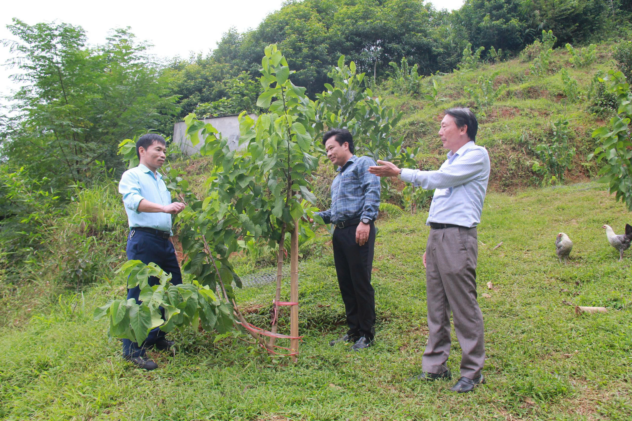 Đại diện phòng Quản lý Khoa học kiểm tra thực tế mô hình cây na tại xã Bạch Thông, tỉnh Thái Nguyên